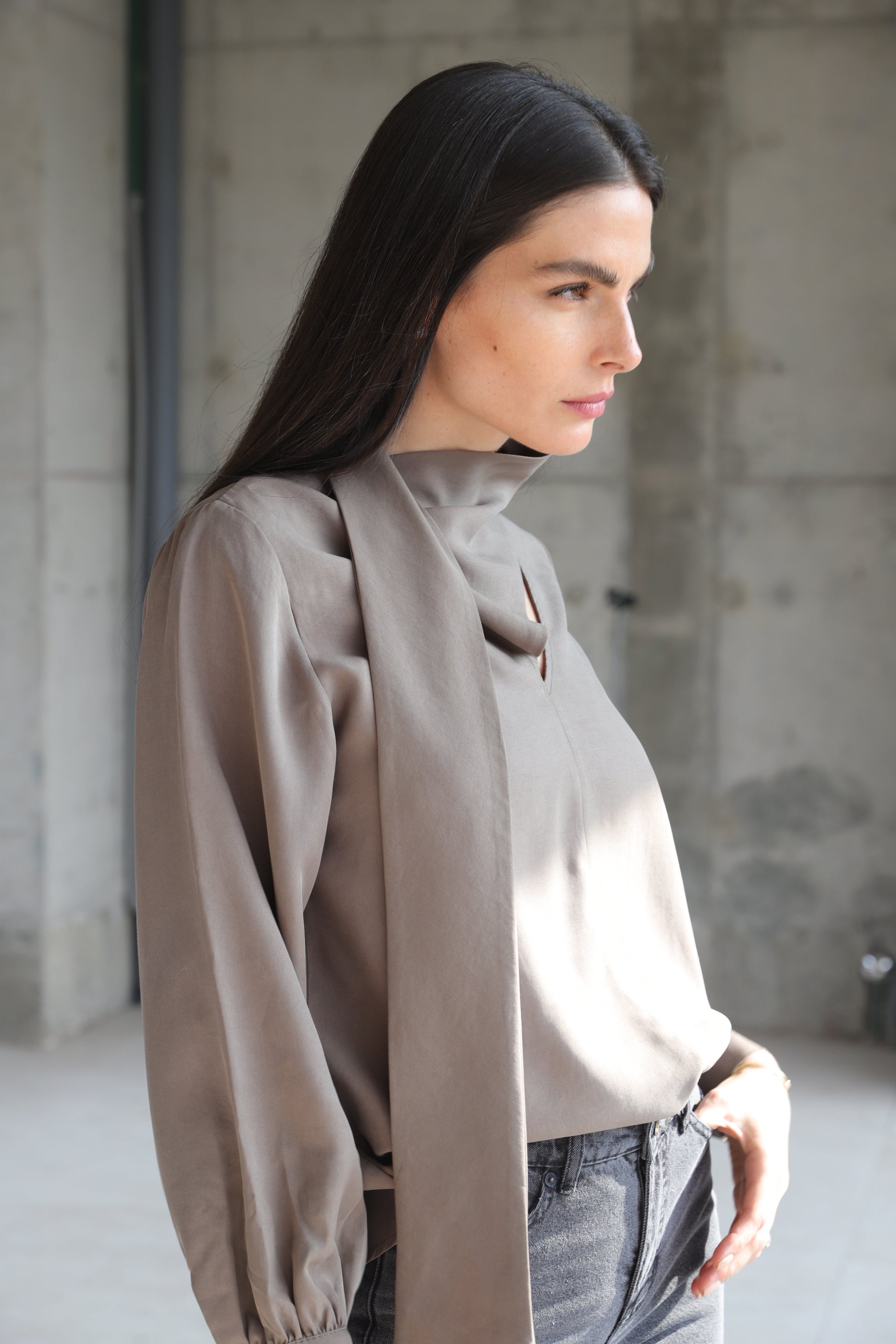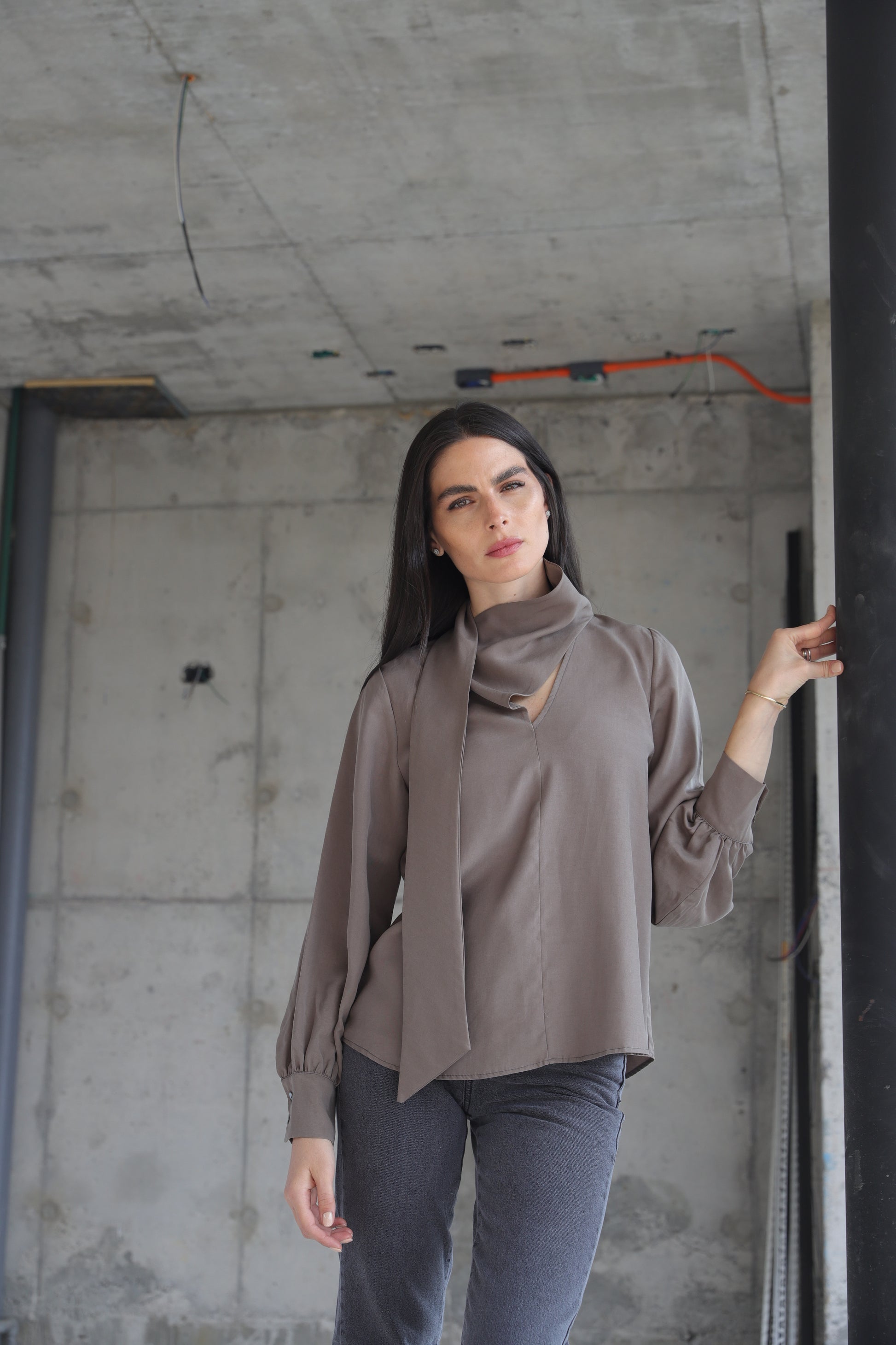 Camisa escote en V con lazo en el mismo tencel. Manga larga y aglobada en el puño. Cierre de botón en el cuello. Toma tu talla normal.