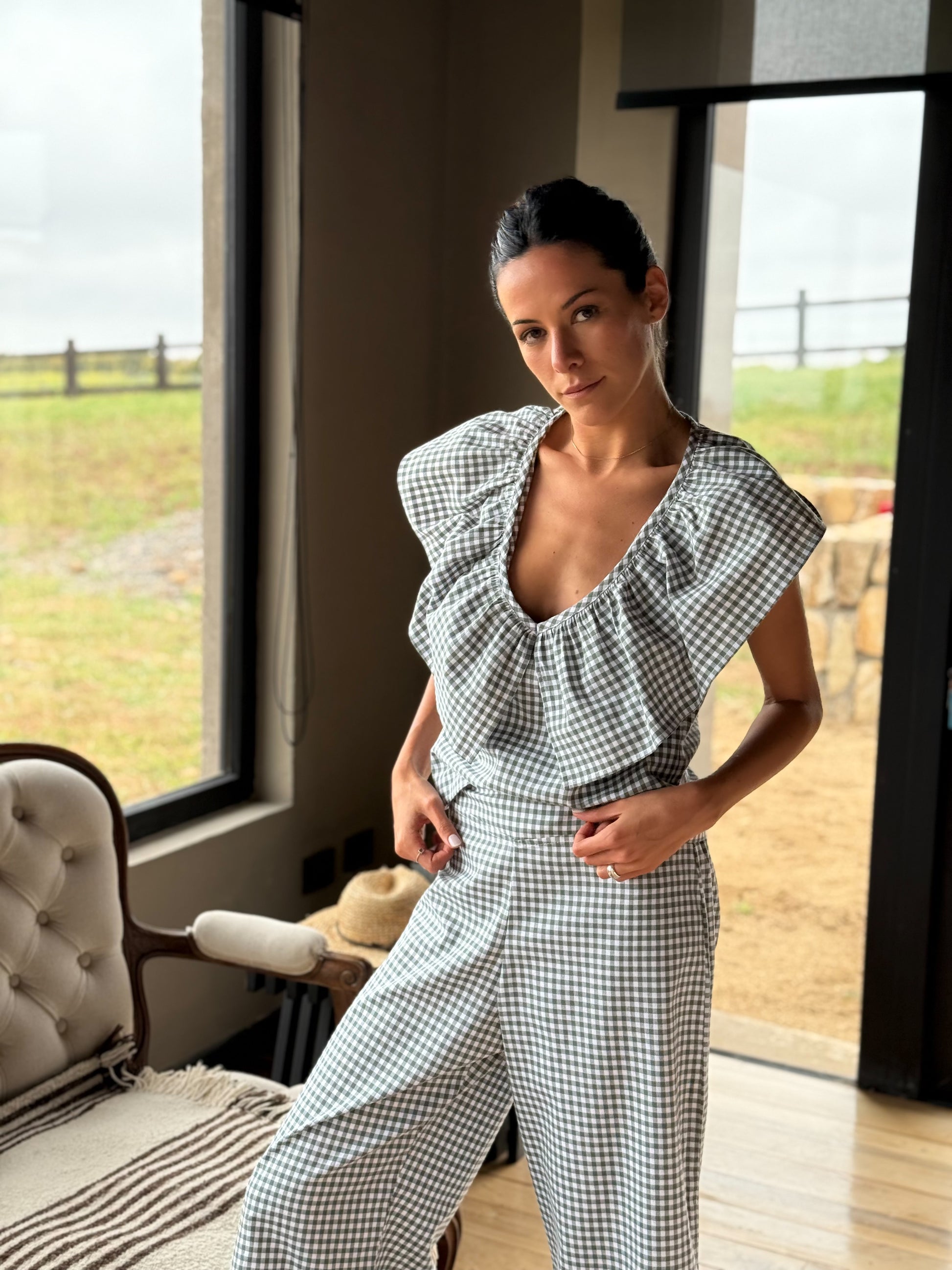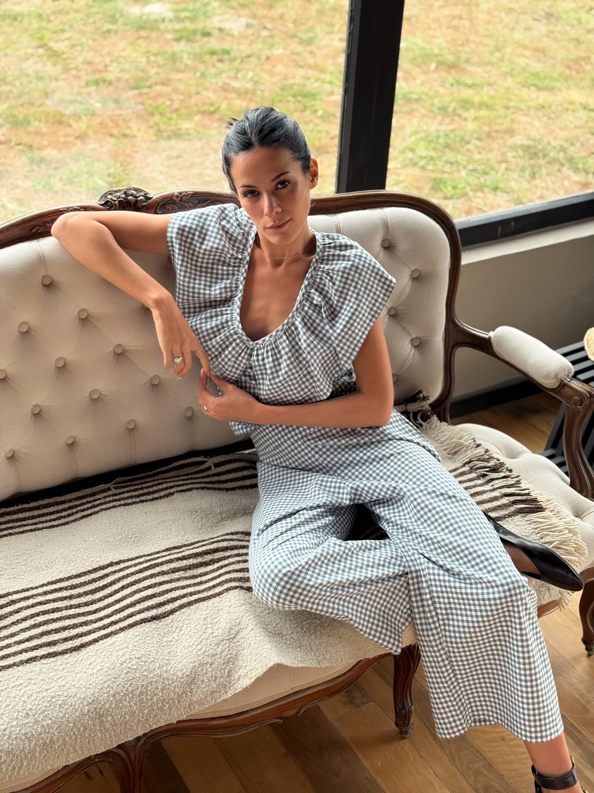 Blusa de algodón, con cierre de botones laterales y escote en V terminado en importantes vuelos. El Vichy sin duda es el diseño del momento, en un verde veraniego precioso.