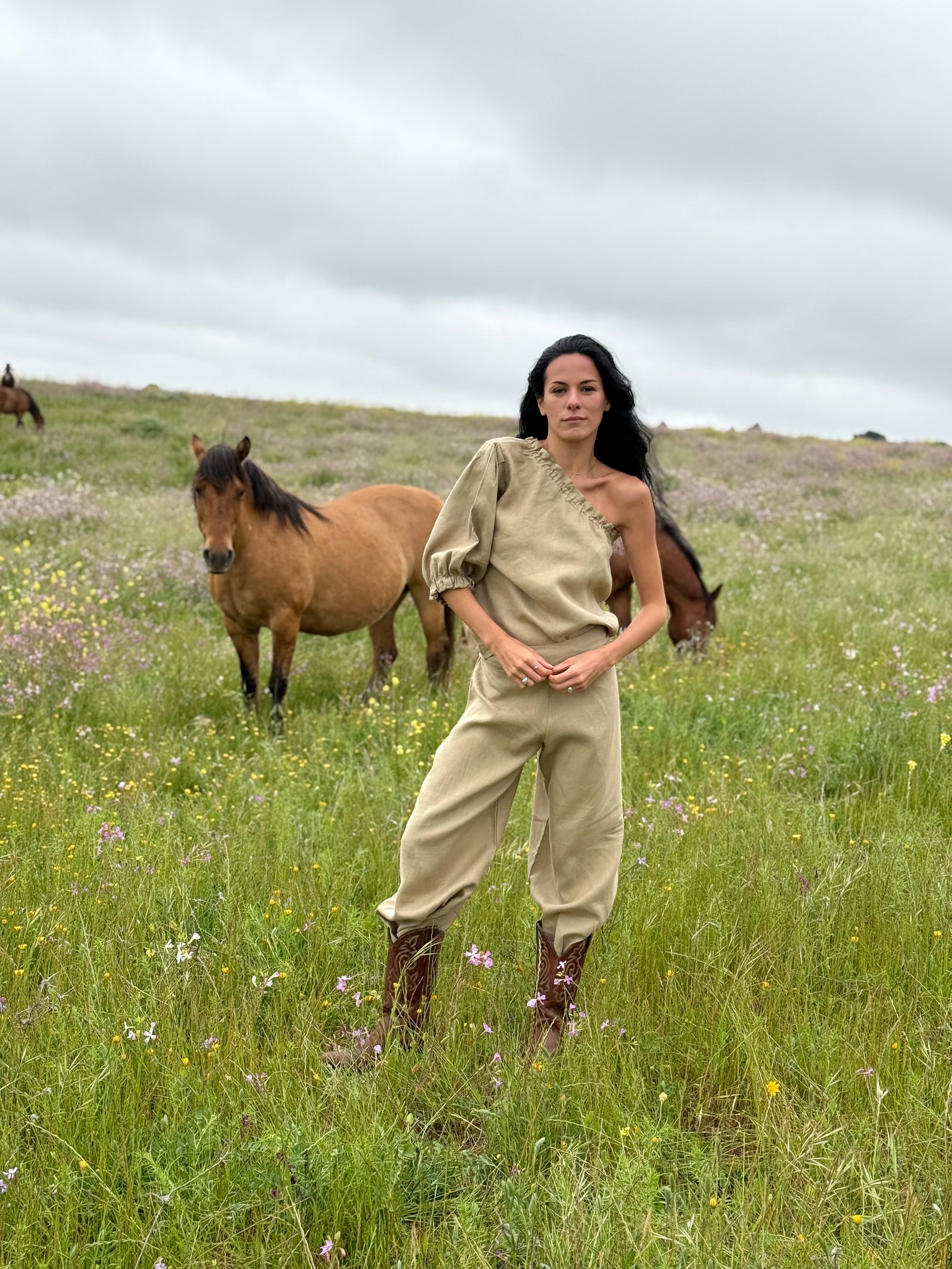 Blisa 100% lino, teñido en color tierra. De caída relajada, y corte asimétrico con manga globo. Una blusa que se adapta a cada cuerpo con su eS vote en elástico.