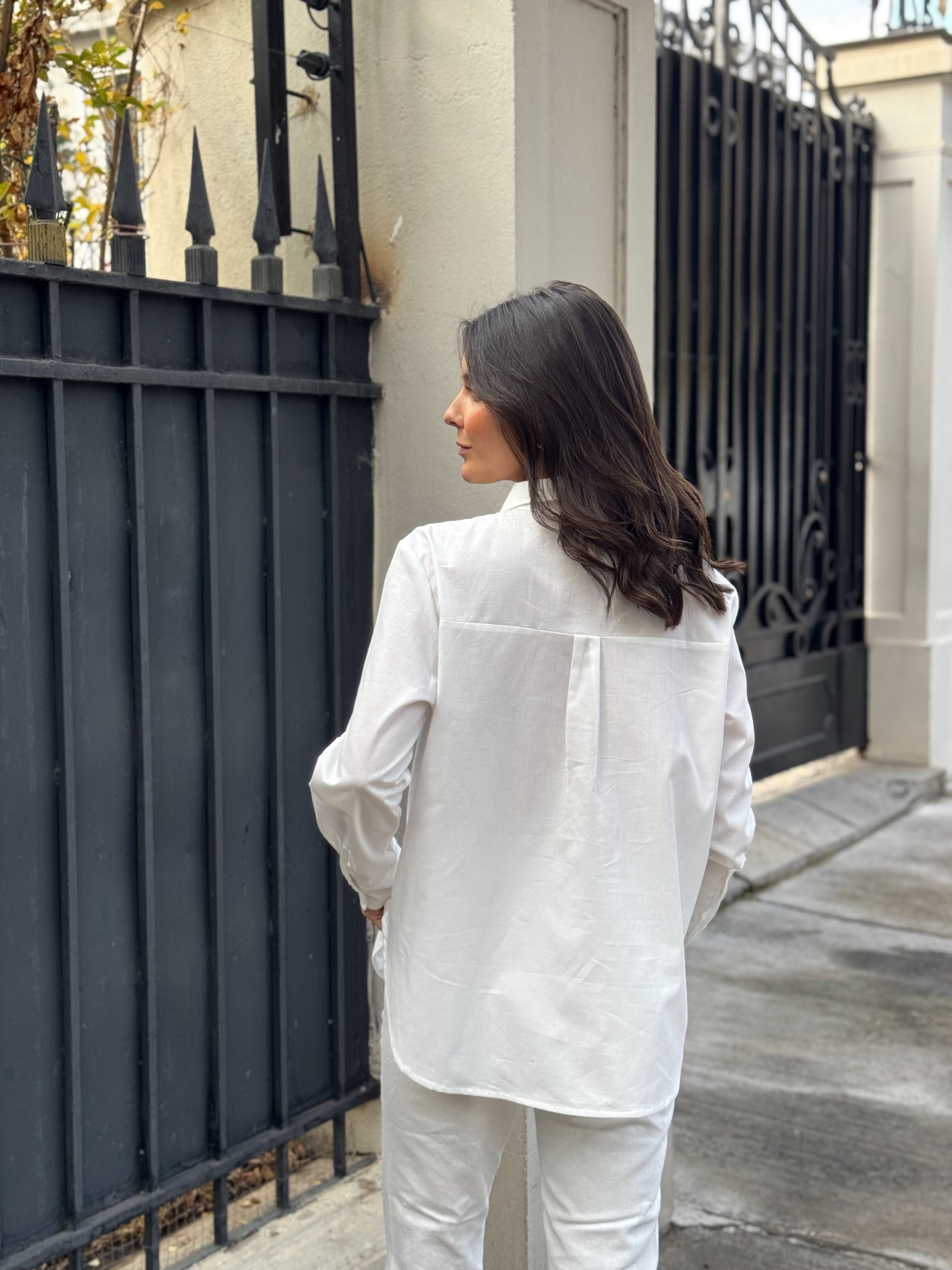 Una camisa blanca limpia, atemporal y fácil de usar con todo, que se vuelve una de esas prendas que siempre terminan en el outfit final.