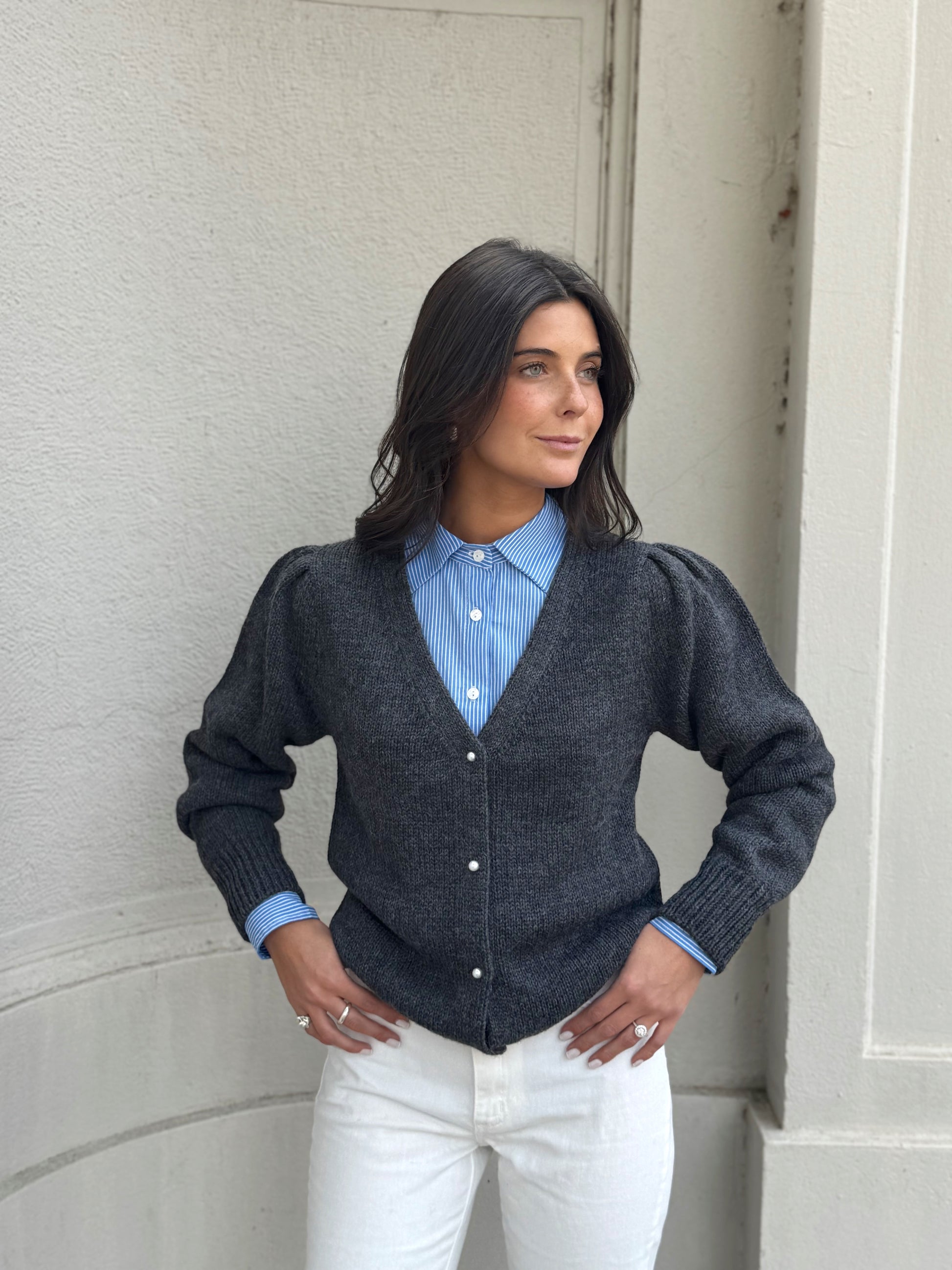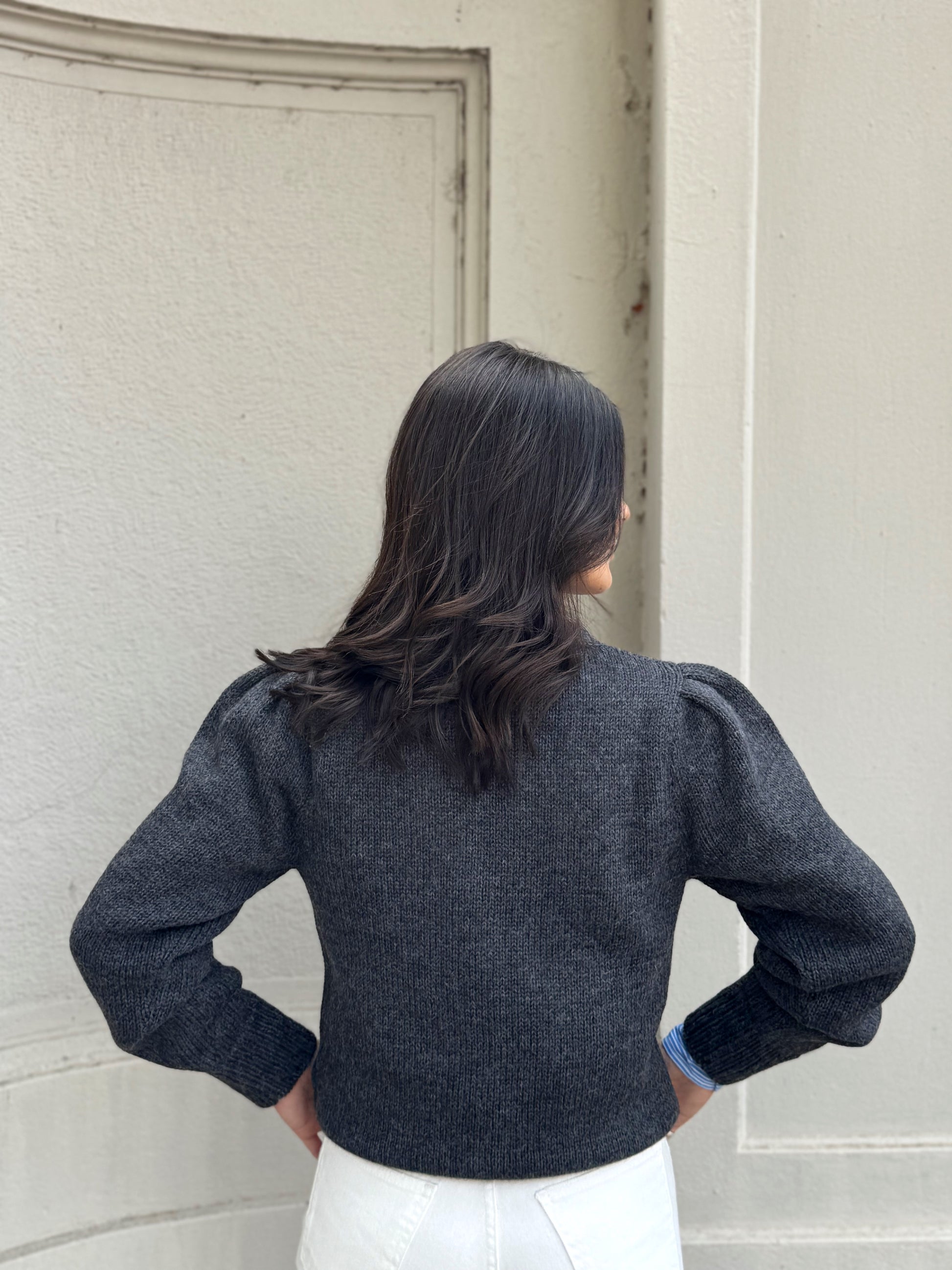 Confeccionado en una mezcla de alpaca, lana y acrílico, cuidadosamente seleccionada para lograr una textura cálida, liviana y suave al tacto. Tejido en Perú y diseñado por C. del Pilar, su escote en V, horma holgada y mangas abullonadas con puño ajustado lo convierten en una prenda clave para vestir en capas con un aire relajado y femenino.