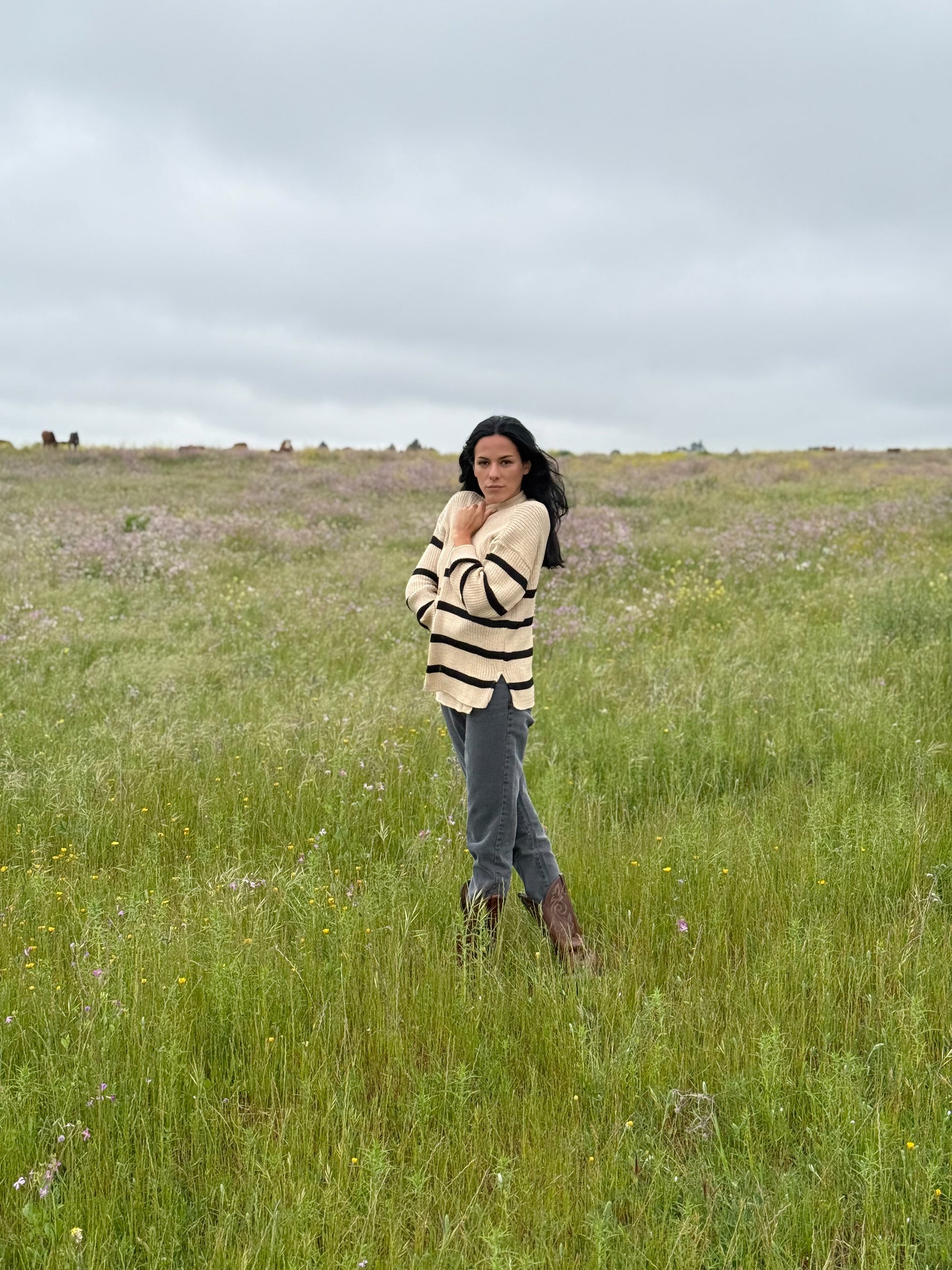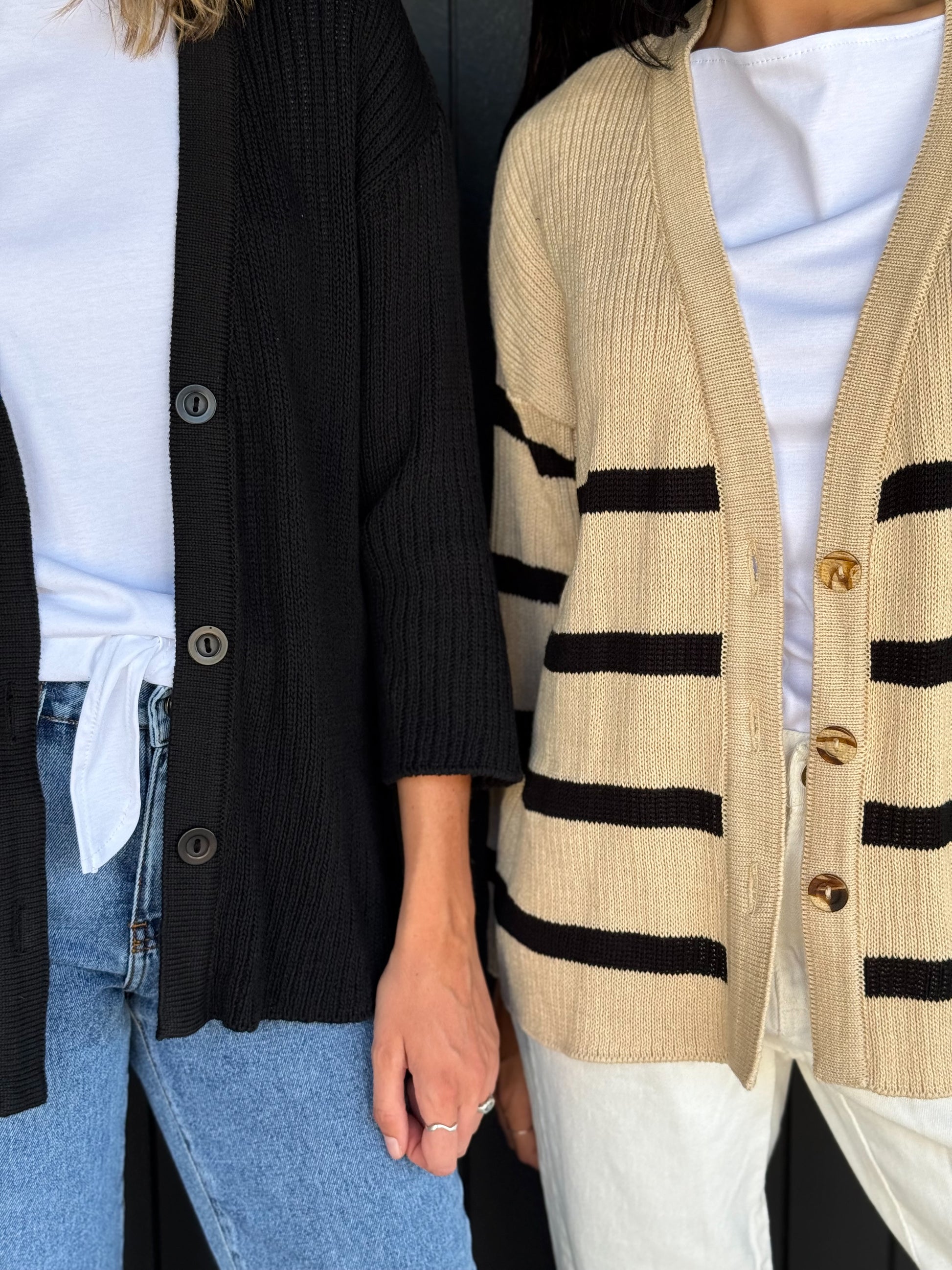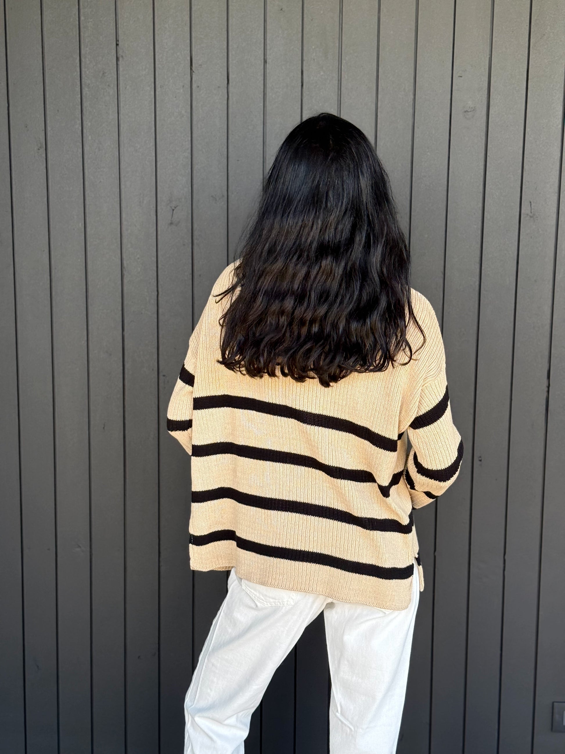 Chaleco 100% de algodón, diseñado y fabricado en Chile para C. del Pilar. En beige con líneas negras.