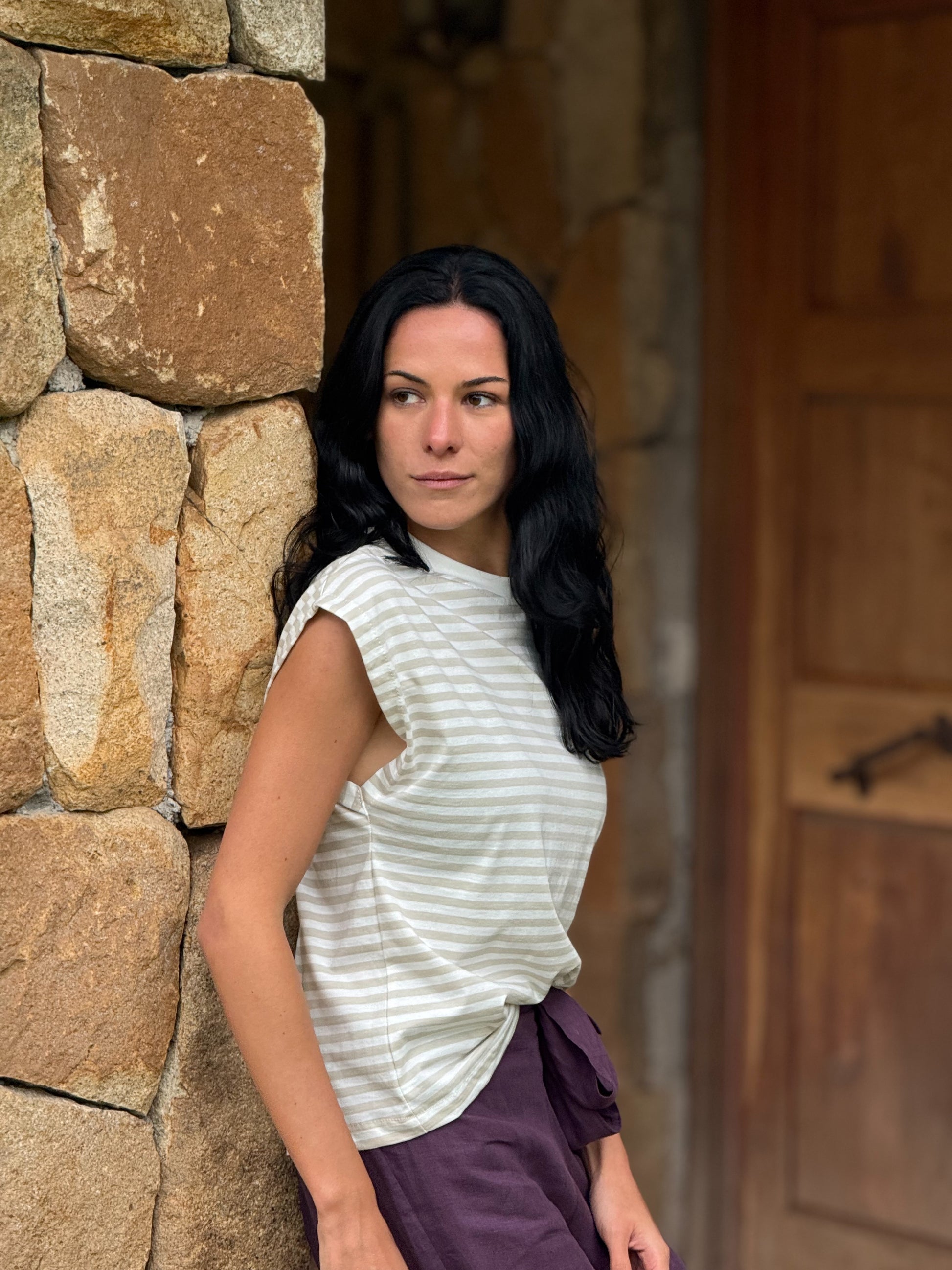 Polera de algodón pima, en líneas blancas con beige, ideales para el verano. Una manga sin costura de sisa.