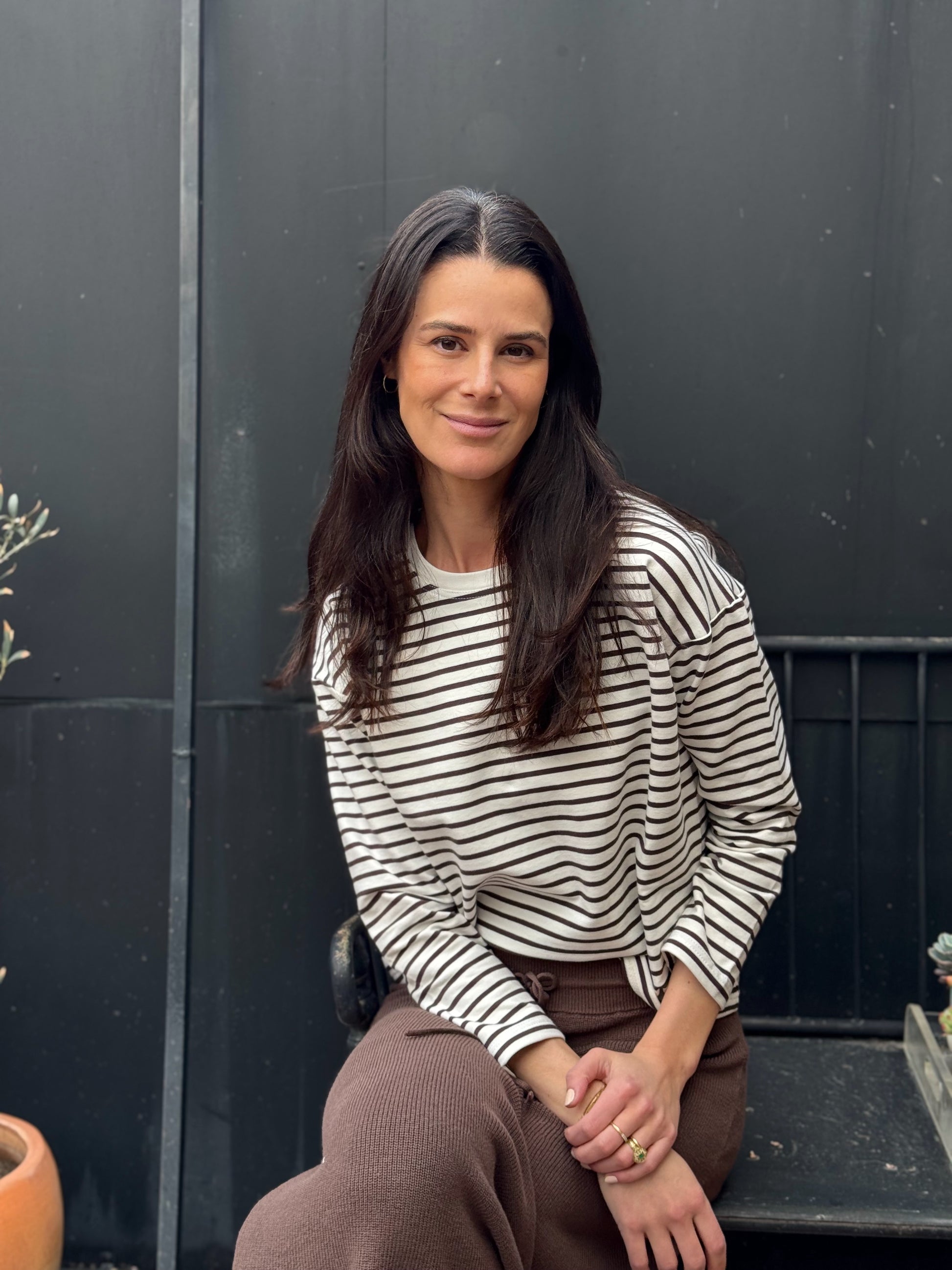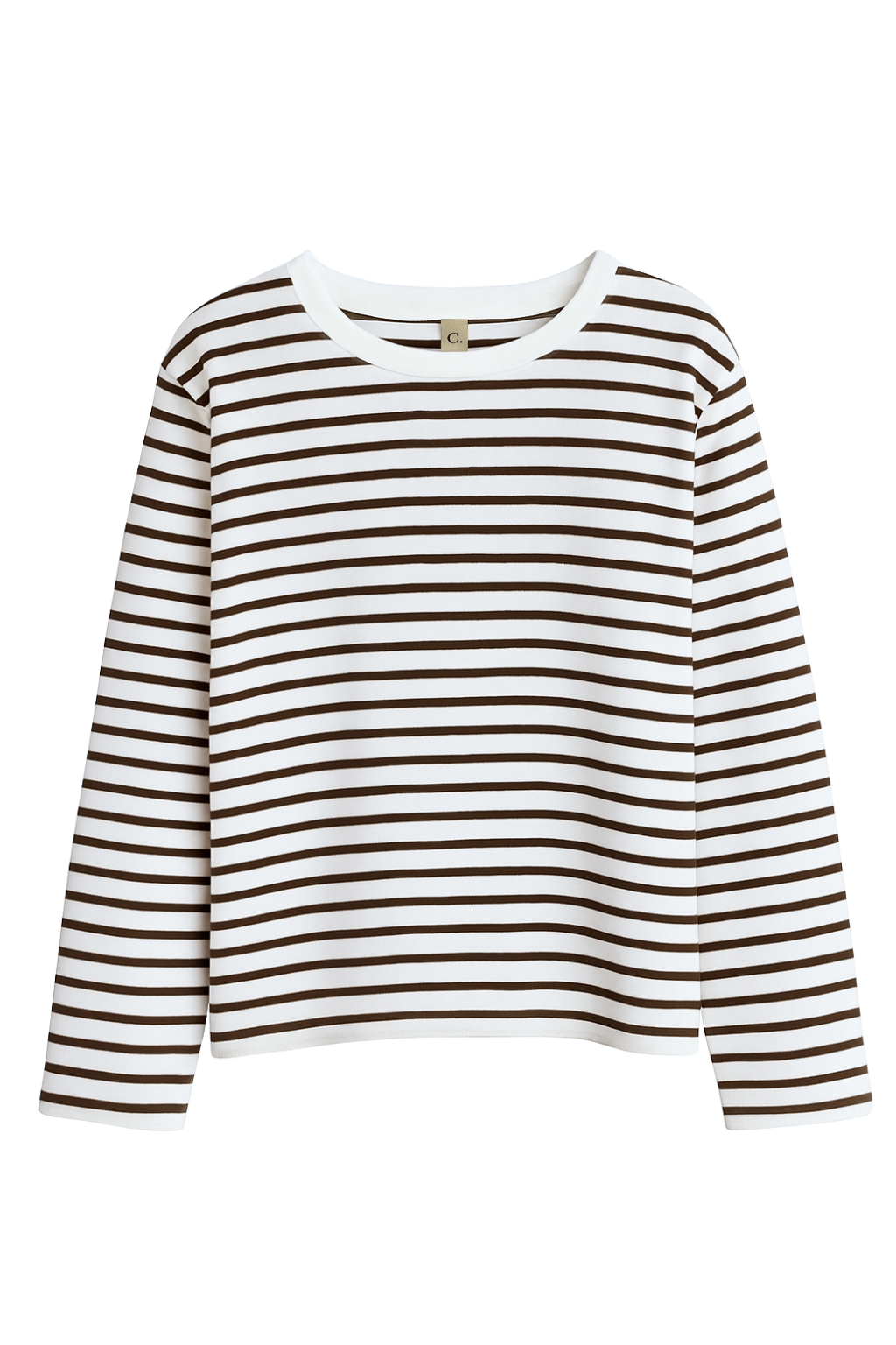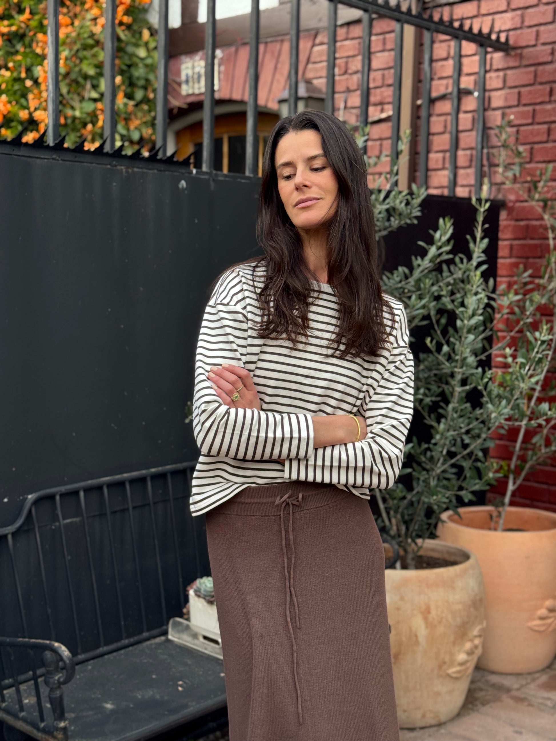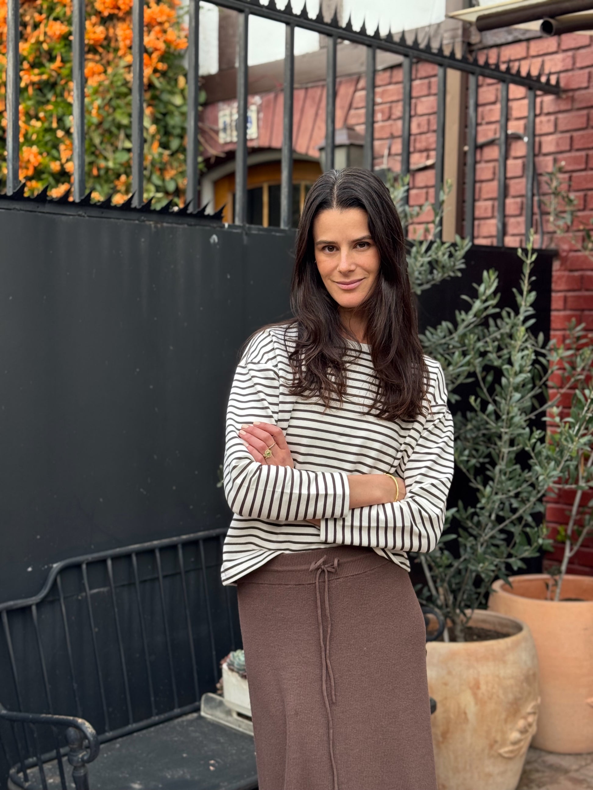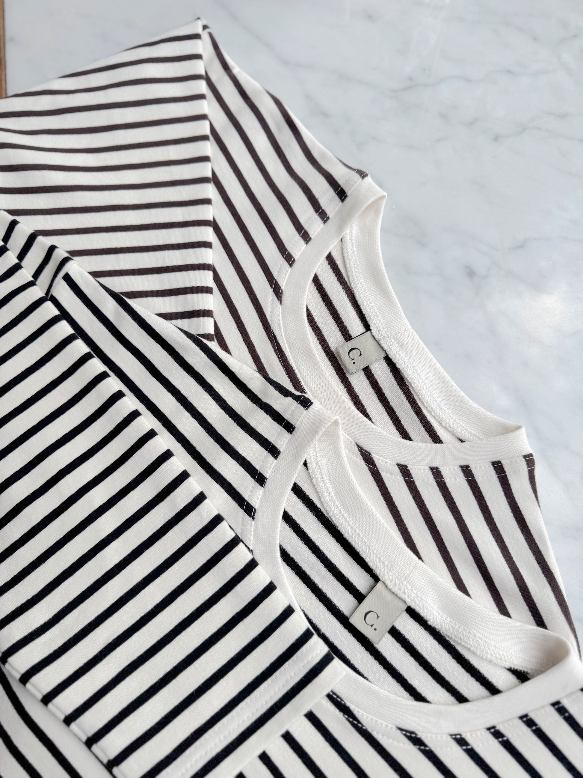 Blanco con rayas café oscuro: una combinación cálida y elegante, ideal para acompañar tonos tierra, beige o denim.