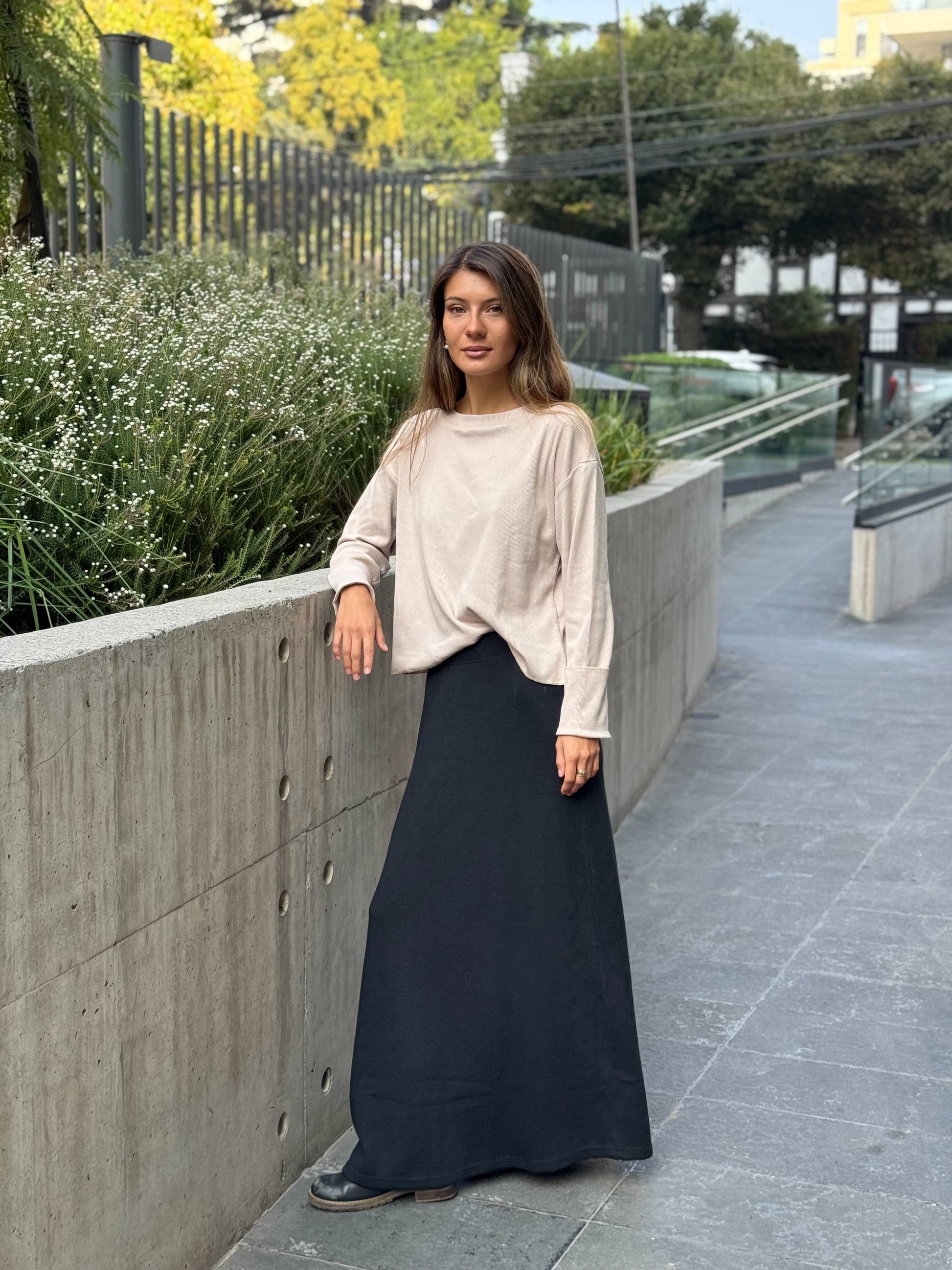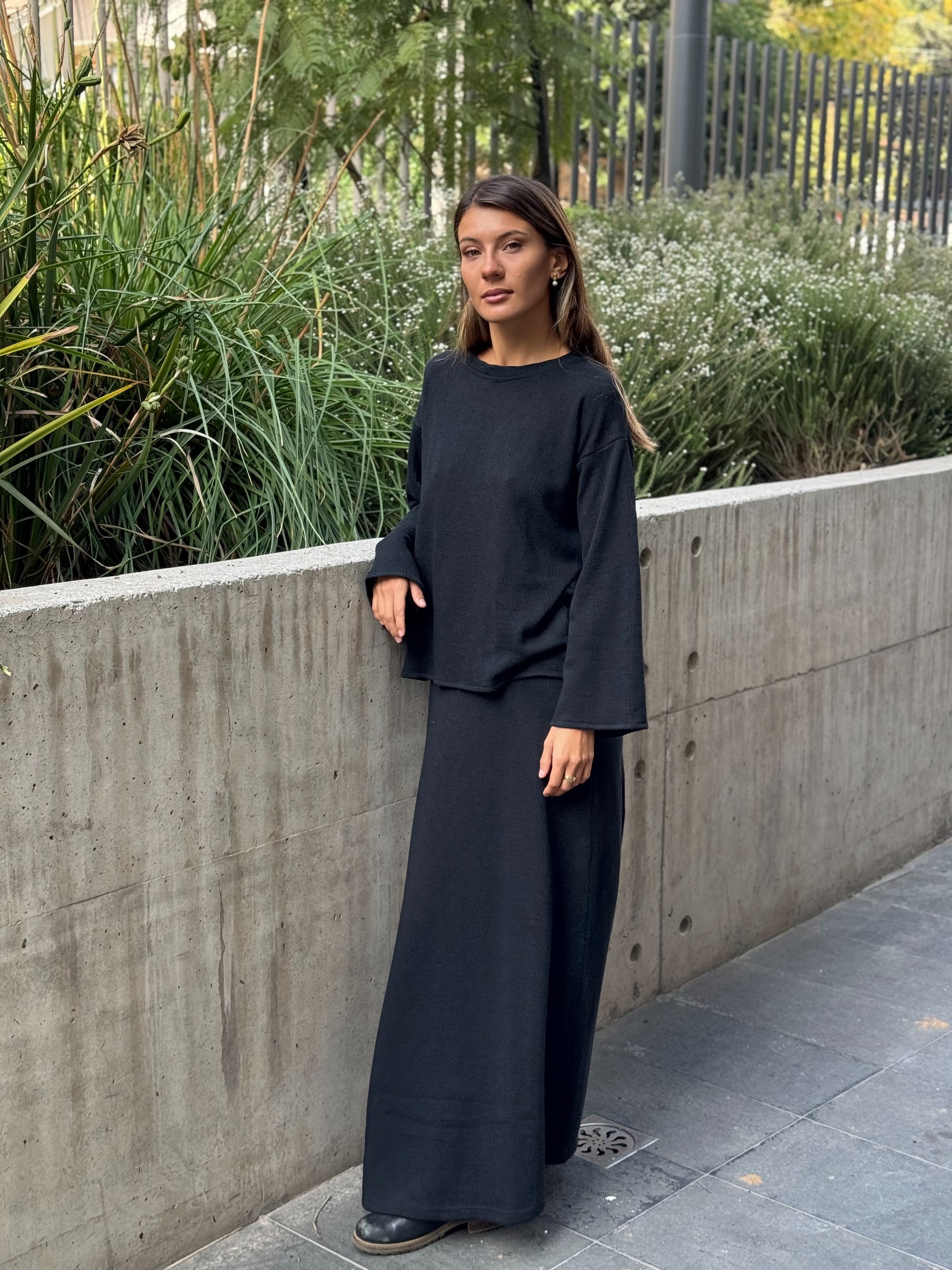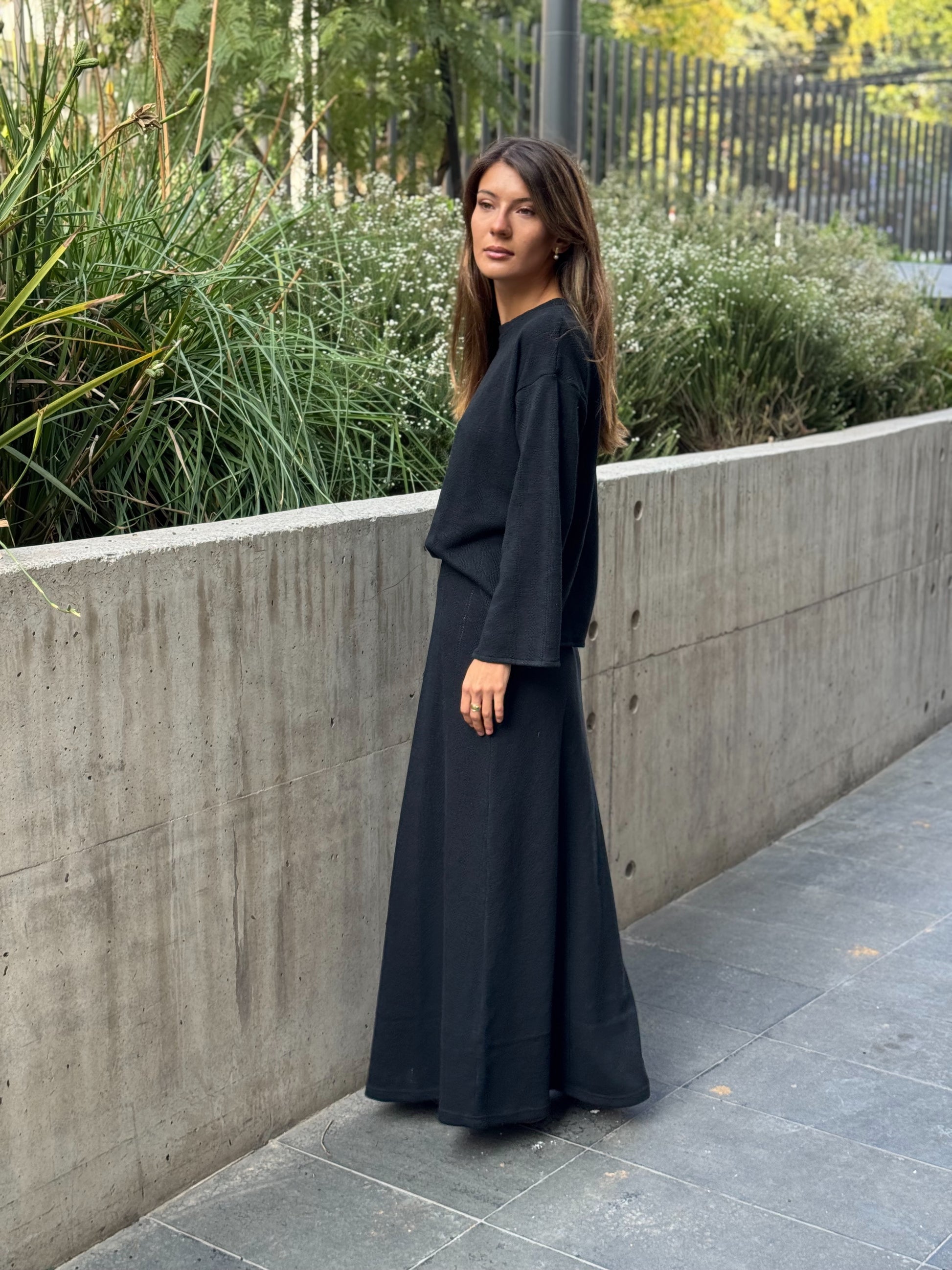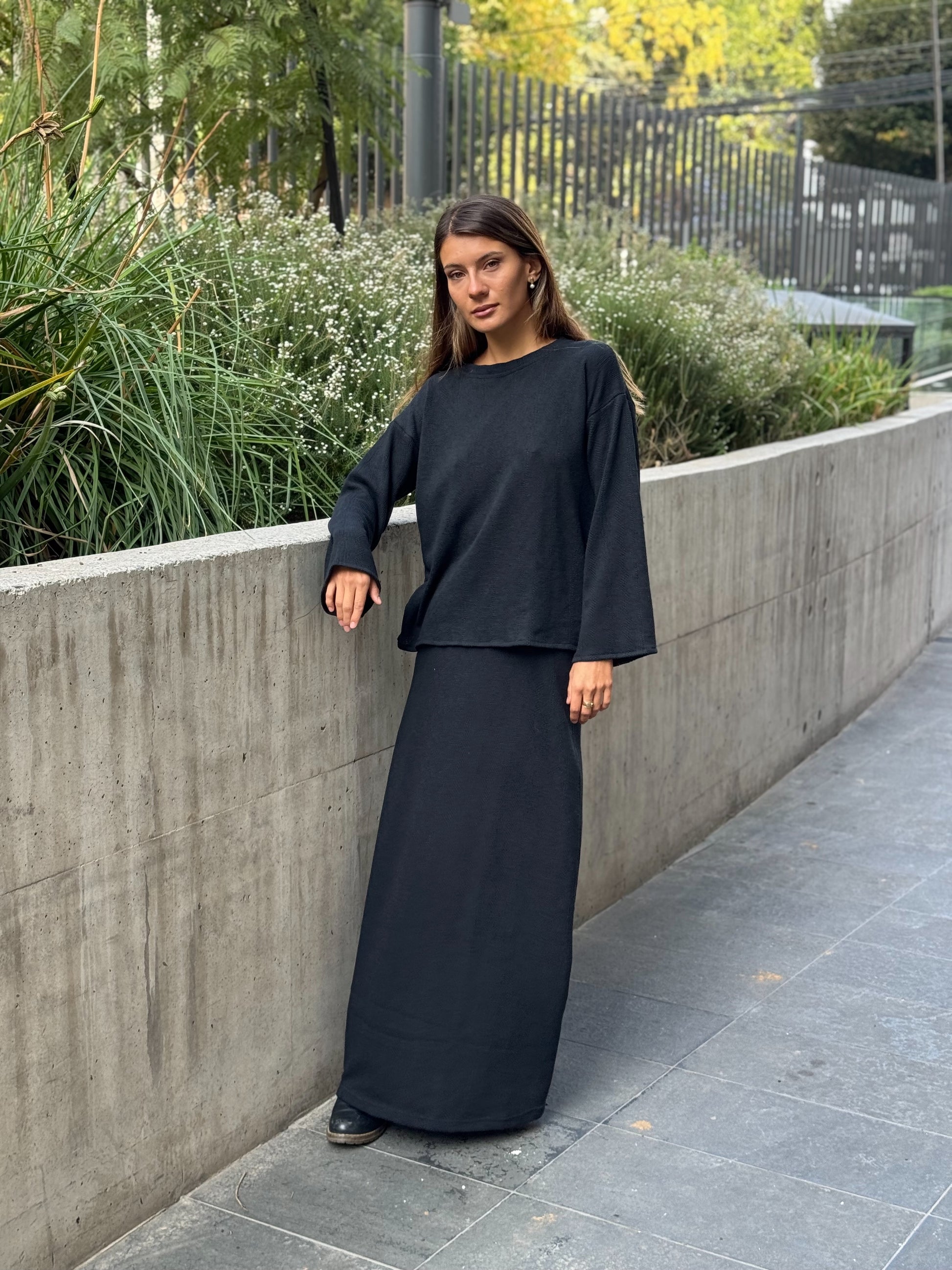 Falda larga de tiro alto, diseñada por C. del Pilar y confeccionada en punto de hilo 100 % algodón. Su pretina elasticada permite un calce cómodo y adaptable, mientras su tejido entrega una caída fluida con textura delicadamente marcada, que aporta cuerpo sin perder ligereza.