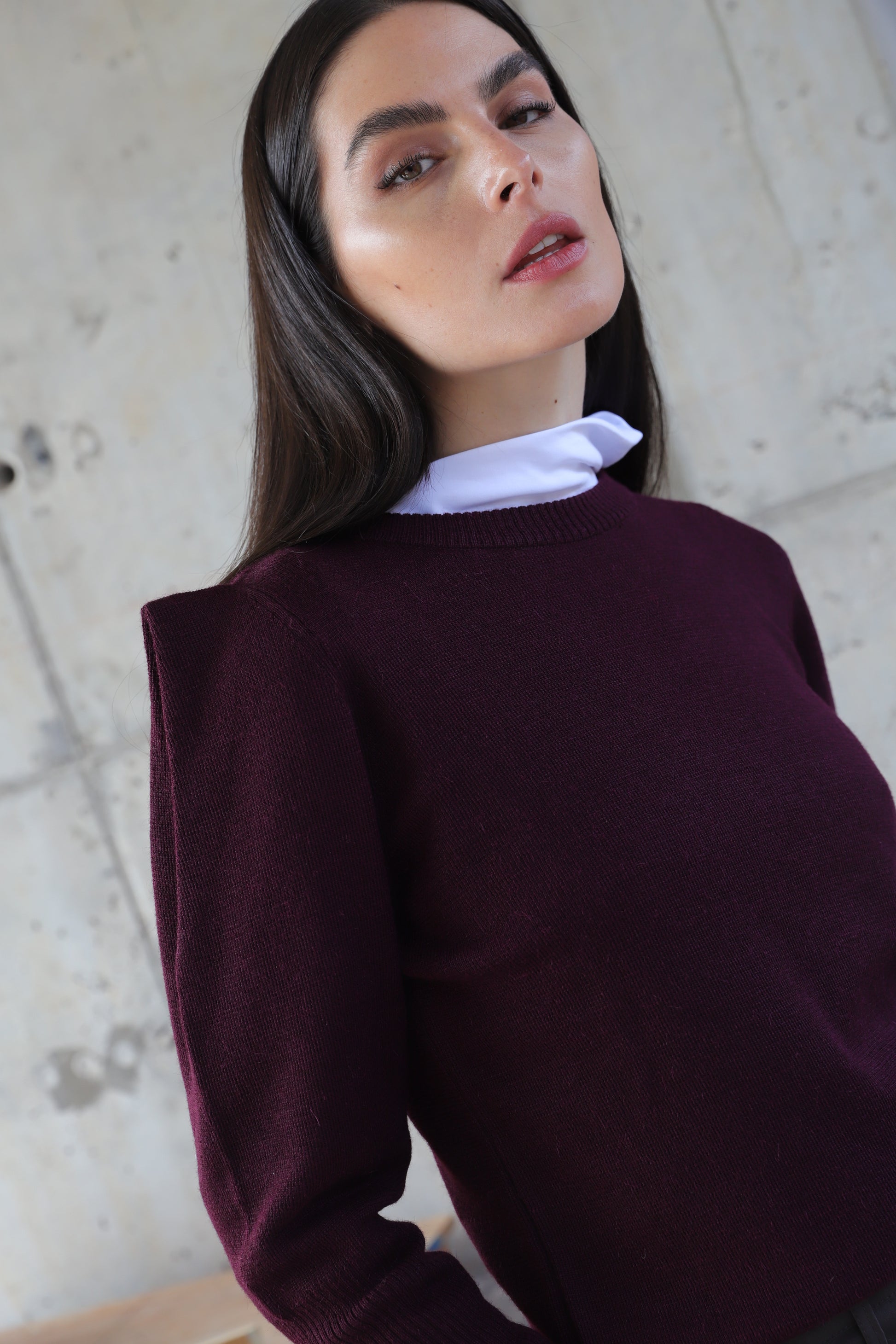 Tejido de cuello redondo y manga larga. Detalle de pinzas en los hombros con efecto hombrera.