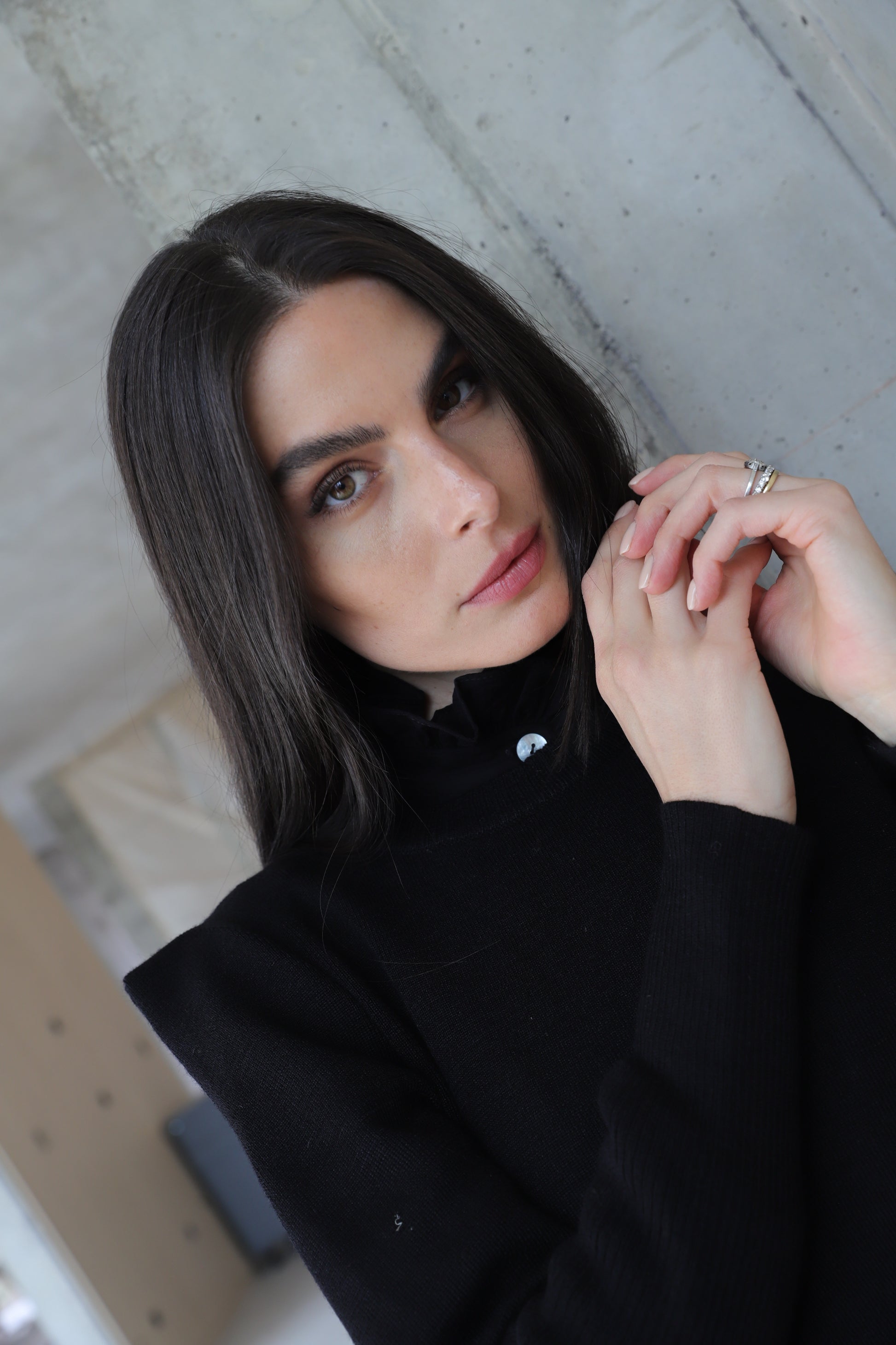 Tejido de cuello redondo y manga larga. Detalle de pinzas en los hombros con efecto hombrera.