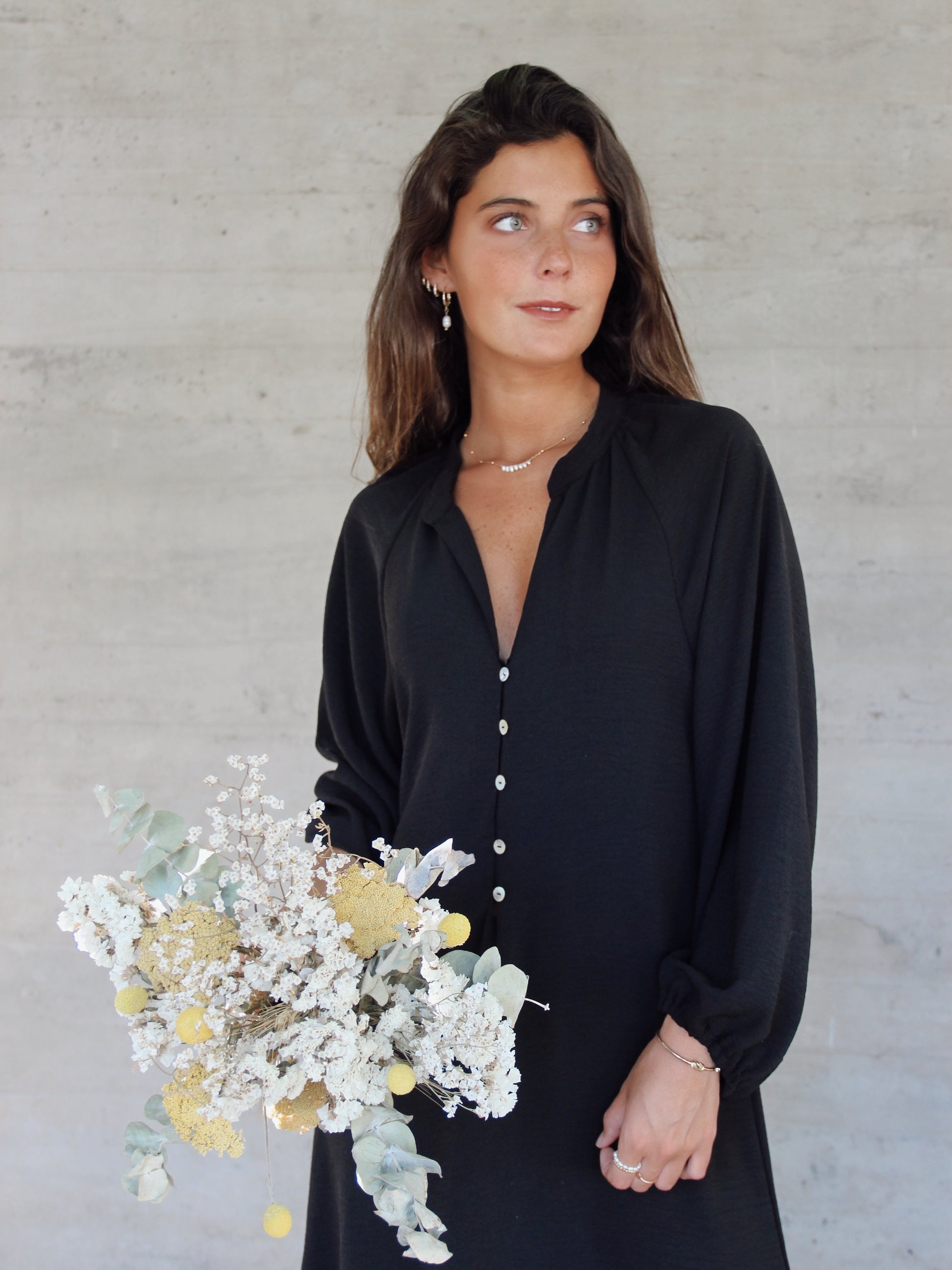 Vestido Midi con escote en V y manga larga con terminación en elástico que da un toque de abullonada. Tiene como cierre botones de concha y perla, que le dejan una apariencia delicada y simple.