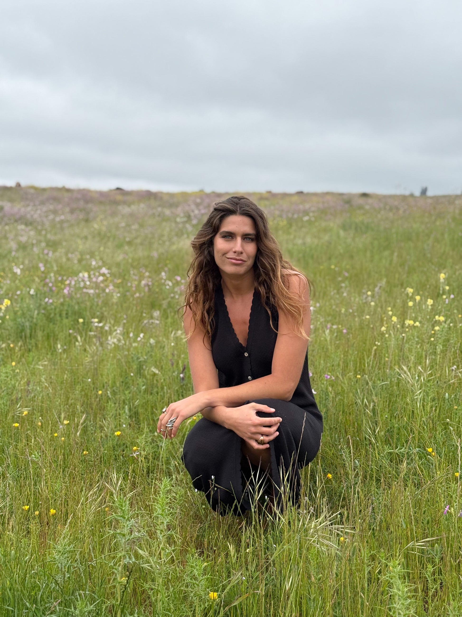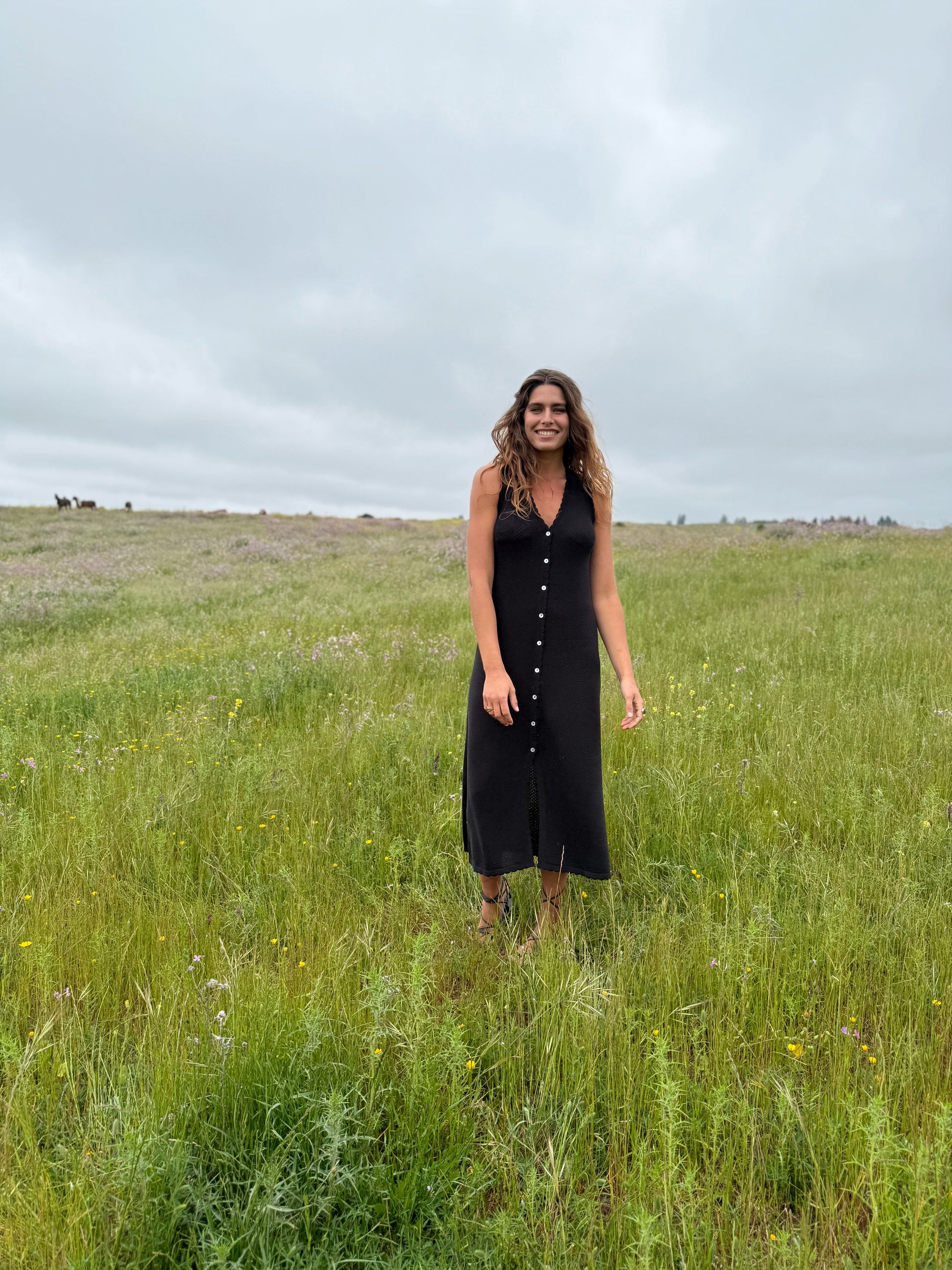 Vestido de algodón 100%, diseñado por C. del Pilar fabricado en Perú. De cierre frontal con preciosos botones de concha y perla. Terminaciones en ondas por todo el rededor, dándole un toque más romántico al tejido.